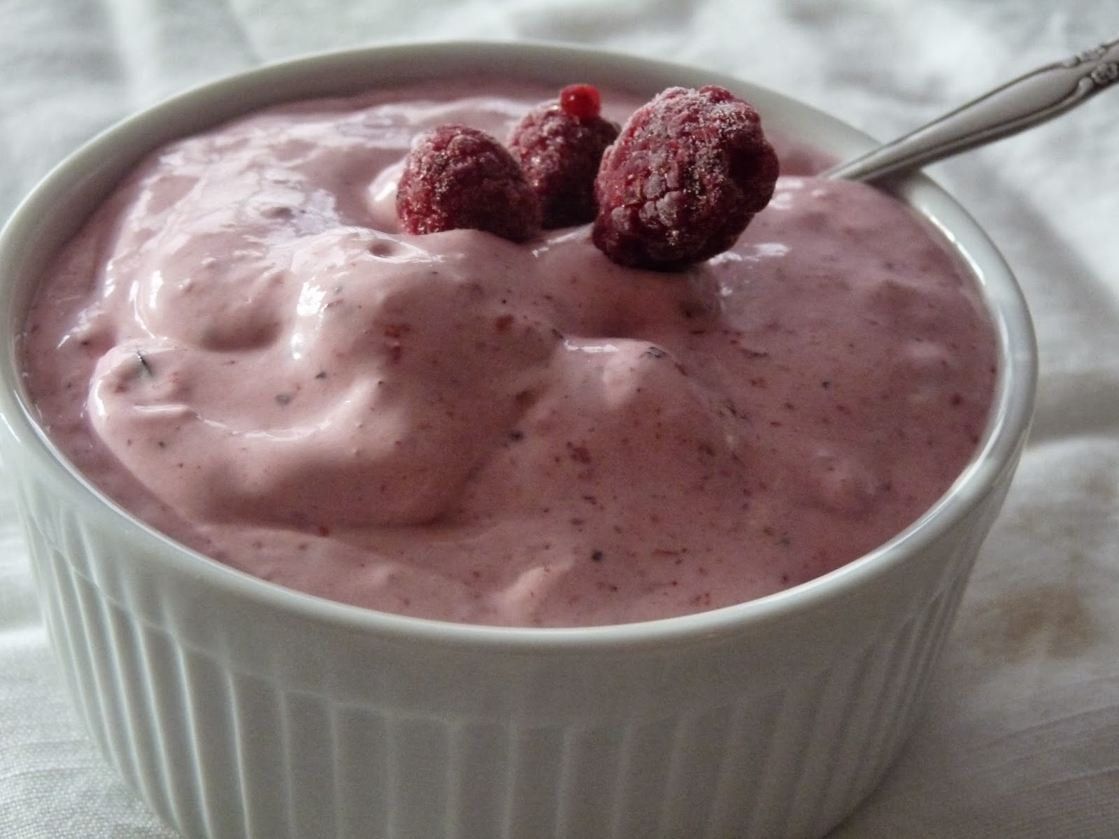 Once chilled, place the yogurt and the berries in a food processor and blend until creamy and smooth. Serve and enjoy immediately with toppings or as is.